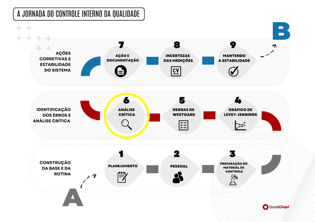 A análise crítica representa a sexta etapa da "Jornada do Controle Interno da Qualidade (CIQ)", um sistema composto por nove etapas para garantir que os processos analíticos funcionem corretamente e que os resultados sejam entregues com segurança.