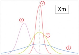 Curva 2 – vermelha – uma variabilidade muito boa (pequena), mostrando distribuição dos valores mais próximos da média. O CV deve estar confortavelmente abaixo da imprecisão máxima permitida.