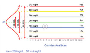 O gráfico de controle é uma representação visual da variabilidade dos resultados obtidos das análises do material. A figura 1 mostra a conjugação de imagens, da curva de Gauss (posicionada em rotação no sentido anti-horário) com o gráfico de controle. Baseando-nos nesse princípio, podemos interpretar o gráfico ao lado.