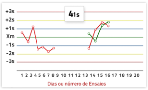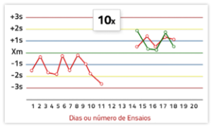 Regra de Rejeição: os resultados não podem ser liberados quando os valores do controle estão no mesmo lado da média em 10 dias consecutivos. Essas observações podem ocorrer para o valor de um controle ou para os 2 controles, significando a observação de 10 ou 5 dias respectivamente (5 observações para o nível 1 e 5 para o nível 2).