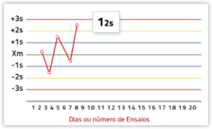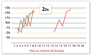 Regra de Rejeição: A regra é inicialmente aplicada em uma mesma batelada para os valores de 2 controles (2 níveis). Os resultados não são liberados quando os valores de 2 controles excedem os limites de + 2s ou – 2s, no mesmo dia. A regra pode ser aplicada também em 2 observações consecutivas (2 dias) para um mesmo controle. A violação indica um erro sistemático.
