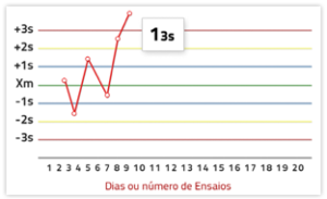 Regra de Rejeição: significa que os resultados devem ser rejeitados porque o valor de um dos controles excede o limite de Xm ± 3s. Este é um critério usual ou limite de rejeição para o gráfico de Levey-Jennings. A violação dessa regra indica um aumento do erro aleatório, mas pode significar eventualmente um erro sistemático de grandes dimensões.