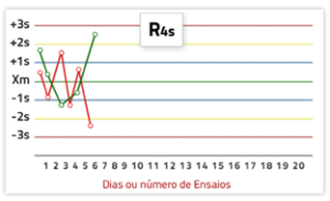 Regra de Rejeição: os valores obtidos devem ser rejeitados quando a diferença entre os dados dos 2 controles é maior que 4s, sendo aplicável somente quando há 2 níveis instalados. Assim quando o valor de um controle excede +2s e o valor do outro controle ultrapassa -2s, cada observação ultrapassa 2s, mas em direções opostas, fazendo uma diferença maior que 4s. Deve-se considerar que a diferença deve ser maior que 4s, mesmo que um resultado não ultrapasse 2s. É indicadora da ocorrência de erros aleatórios.