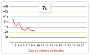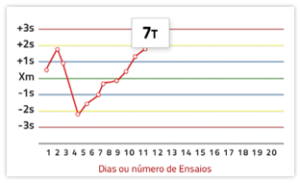 Regra de Rejeição: esta regra é violada quando os valores do controle em 7 dias consecutivos mostram uma tendência crescente ou decrescente, não sendo necessário que os limites de +-2s ou +- 3s sejam ultrapassados. Esta regra indica que o sistema perdeu o desempenho esperado e que os resultados obtidos em amostras de pacientes devem ser rejeitados. A violação indica incidência de erro sistemático.